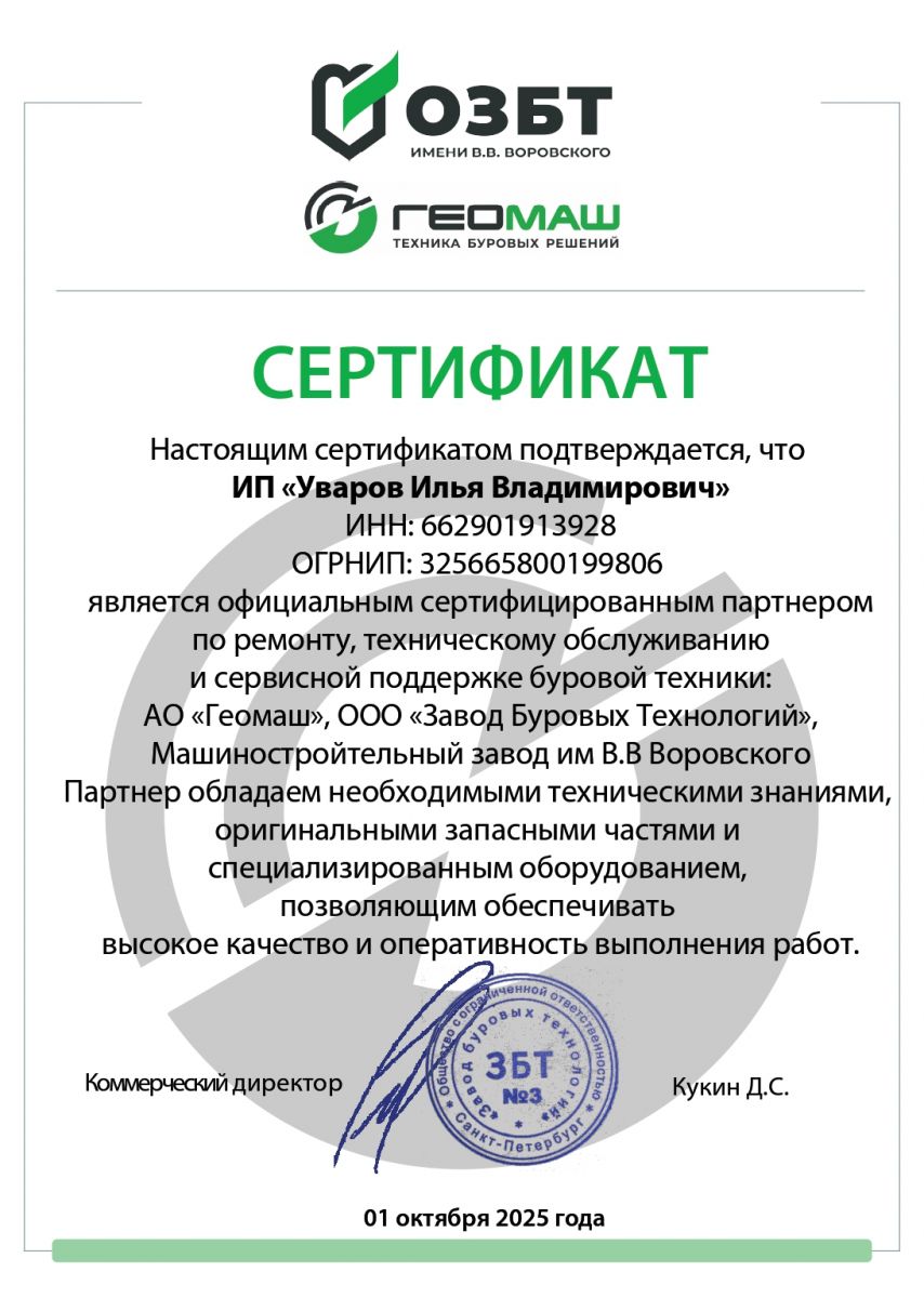 УралБурРемонт (ИП Уваров И.В.) - официальный партнер ГК Геомаш и ОЗБТ им В.В. Воровского в Уральском ФО по ремонту и сервисному обслуживанию буровых установок производства ОЗБТ им В.В. Воровского и Геомаш: УРБ-2А2, УРБ-2Д3, ПБУ-2, УГБ, УРБ-25, УРБ-210 и других моделей.